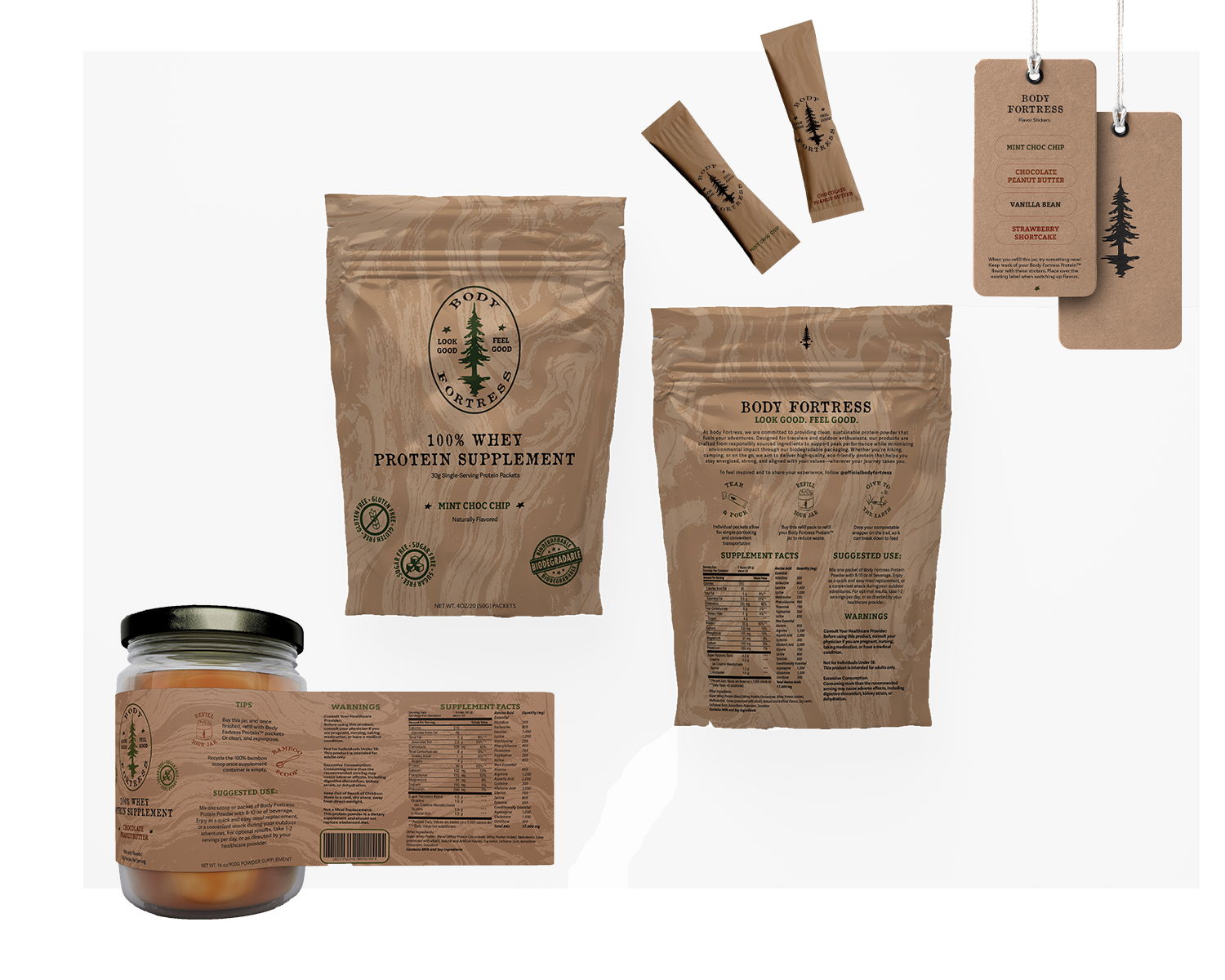 Rebranding for Body Fortress; a sport supplement company specializing in protein powder. Rebranding this product included changing the mission to something more environmentally friendly, and gentler on the eyes.