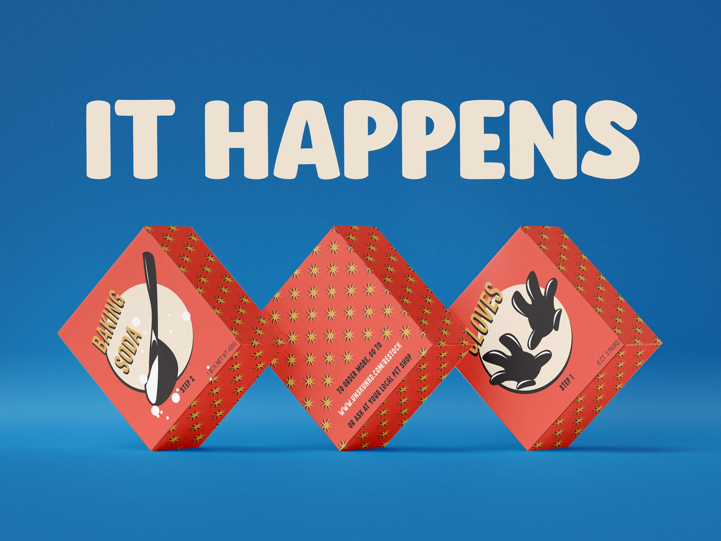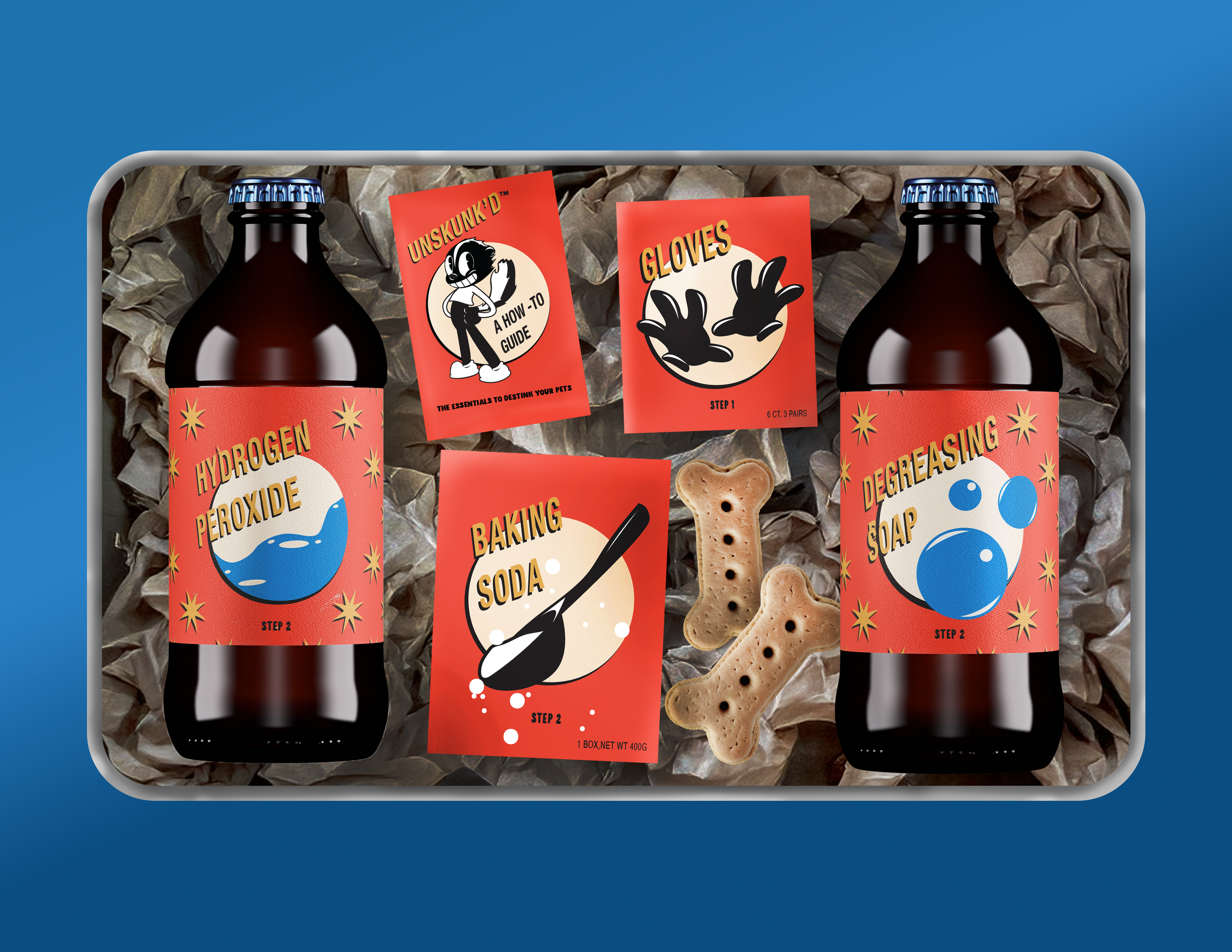 A packaging system designed for Unskunk’d; a kit containing the essentials to take care of a pet getting sprayed by a skunk.
